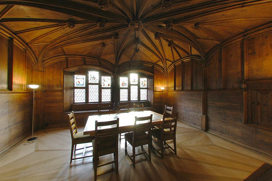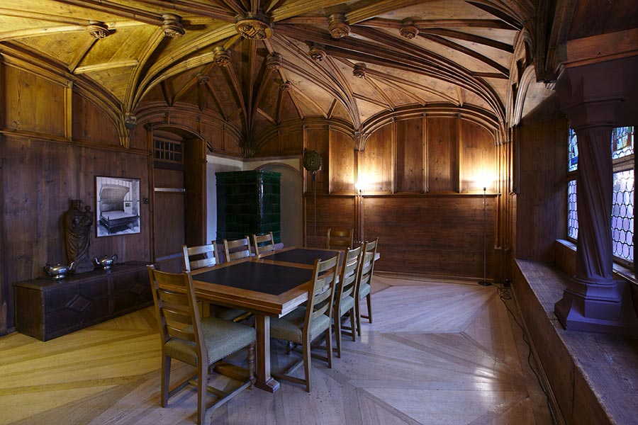 Die vollständig mit Holz ausgekleidete spätmittelalterliche Stube wurde 1509 vom Prior Hieronymus Zscheckenbürlin eingerichtet. Hieronymus war ein angesehener und reicher Basler Bürger bevor er 1487 in die Kartause eintrat. Seine Kontakte pflegte er weiter und begrüsste viele Gäste im Kloster. Das reich ausgestattete Zimmer diente als Gaststube. Es enthielt zwei Holzbetten. „Dieses Prunkzimmer ist mit vertäfelten Wänden und mit einem wunderbaren hölzernen Deckengewölbe versehen. Dieses trägt in der Mitte das Bild Christi und auf den 16 Knotenpunkten der Rippen in einem ersten Kreis die Bilder der vier Evangelisten und der vier grossen Kirchenlehrer, und in einem zweiten acht Engel mit den Marterwerkzeugen. Auf den Zentren der vier Wände unter den dort zusammenlaufenden Gewölberippen befinden sich die Wappen der Spender, der Familien Zscheckenbürlin, Fuchs, Brunn und Oberried.“ Im 19. Jh. wurden im Zimmer die Konfirmationen von Waisenkindern gefeiert.